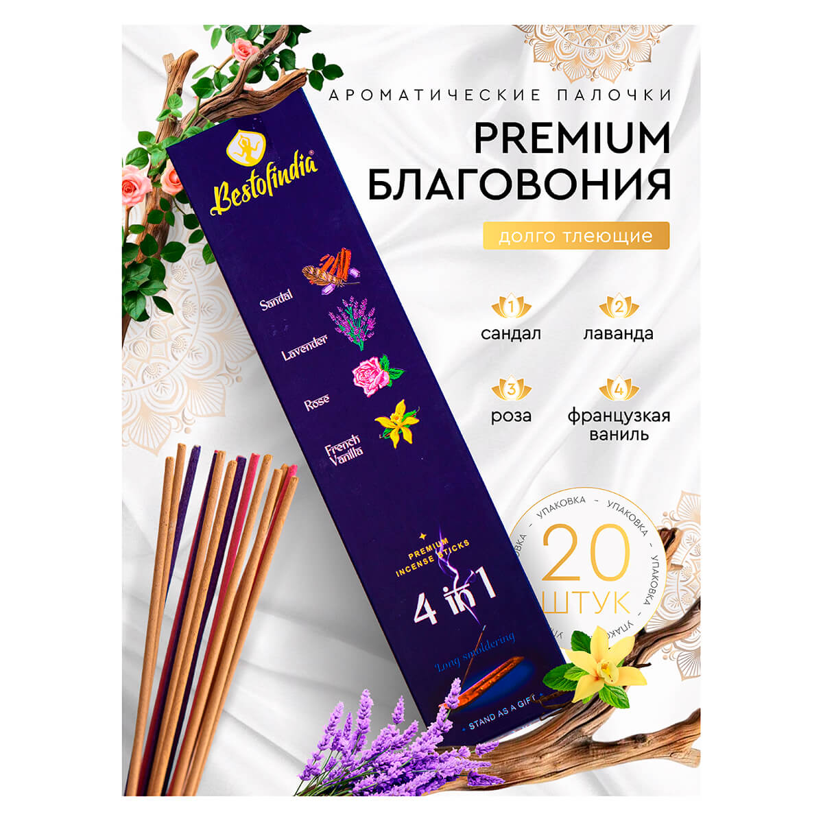 Представьте, что весь спектр любимых классических ароматов всегда у вас под рукой. Набор «4 в 1» от Best of India — это идеальное предложение для ценителей разнообразия и качества. В одном стильном комплекте, включающем деревянную подставку, вас ждут 20 ароматических палочек, разделённых на четыре бессмертных и безупречных букета: умиротворяющий Сандал, успокаивающая Лаванда, романтическая Роза и сладко-нежная Французская ваниль.