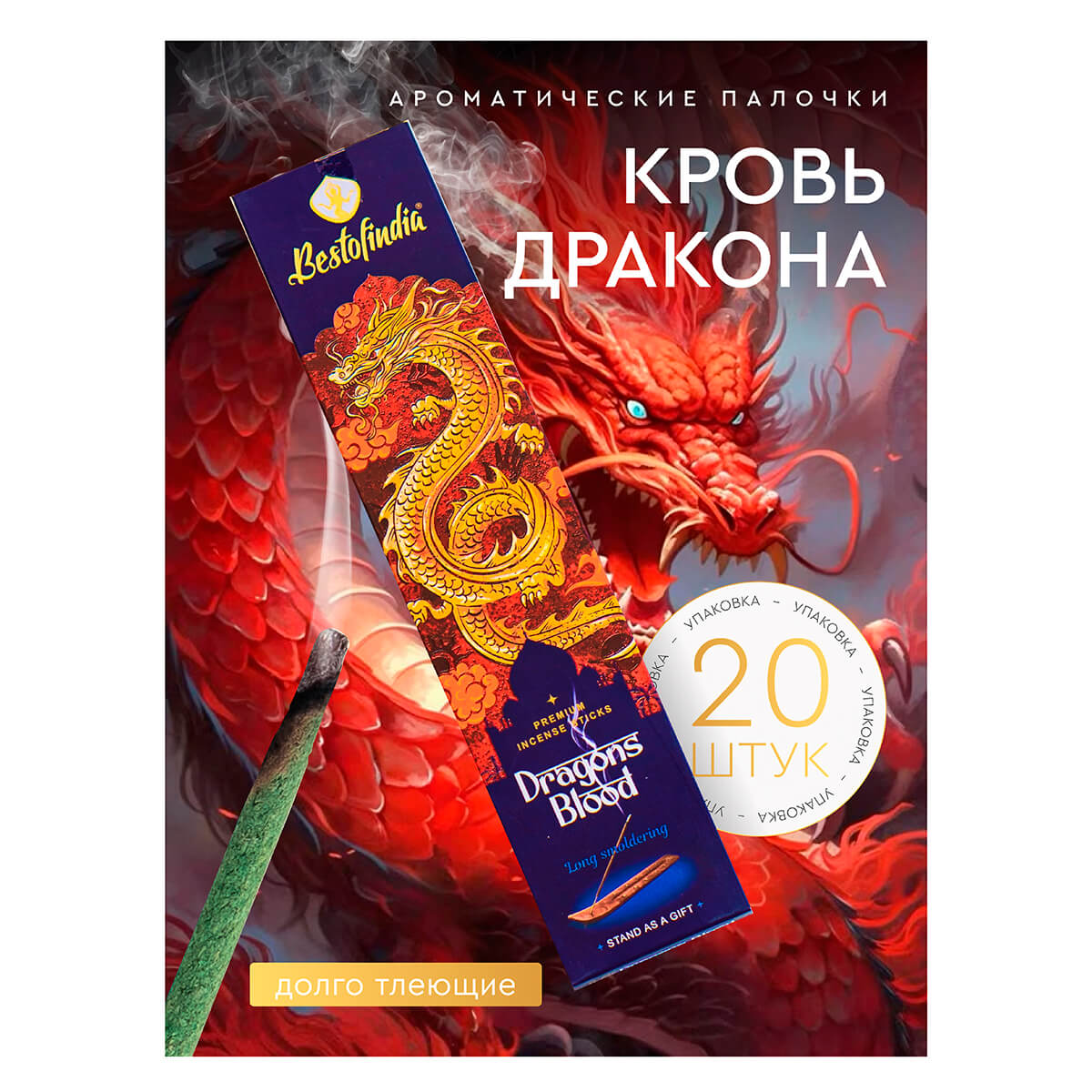 Погрузитесь в мир древних, почти мистических ароматов с набором благовоний «Кровь Дракона» (Dragon's Blood) от индийского мастера Best of India. Комплект из 20 ароматических палочек и изящной подставки дарит не просто уникальный запах, а сильнейший энергетический инструмент, известный своими свойствами с глубокой древности.