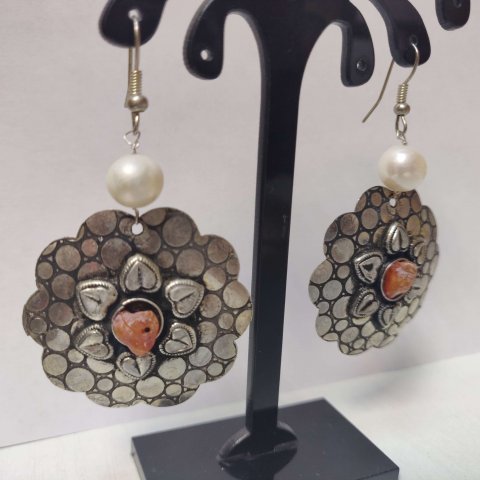 Earrings "Metal Flower" with white pearls and orange stones. Country of origin: India