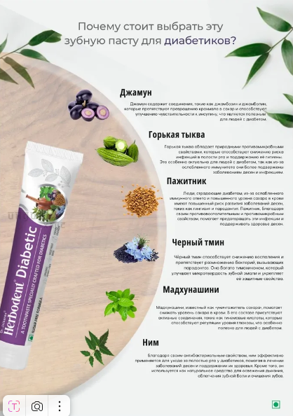 Натуральные ингредиенты Herbodent Diabetic способствуют свежему дыханию, устраняя неприятные запахи и бактерии из полости рта.